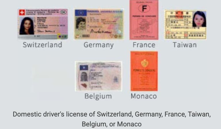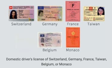 Driver's licenses issued in Switzerland,Germany,France,Taiwan,Belgium,or Monaco,along with a Japanese translation of the license