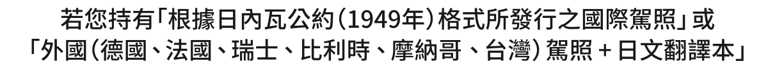 ② 雖是加入《日內瓦公約》的國家簽發的,但基於維也納公約(1968年)樣式的國際駕照。※基於巴黎條約(1926年)、華盛頓條約(1943年)、維也納條約(1968年)樣式的國際駕照,目前在日本國內不被承認。」